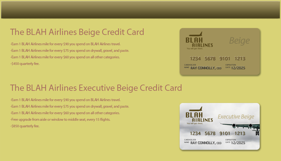 The BLAH Airlines Beige and BLAH Airlines Executive Beige credit cards.